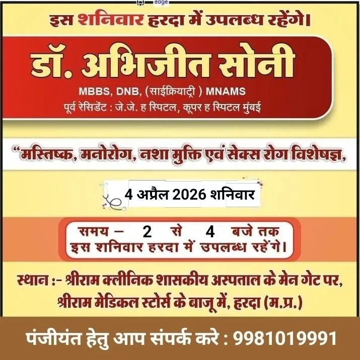 हरदा – मस्तिष्क, मानसिक रोग, नशा मुक्ति व सेक्स रोग विशेषज्ञ डॉ अभिजीत सोनी 4 अप्रैल शनिवार को श्री राम मेडिकल पर उपलब्ध रहेगे !