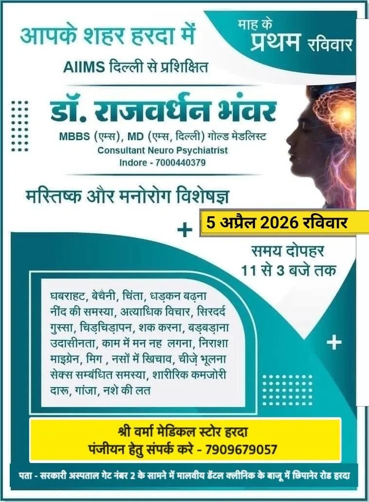 Blog हरदा में 5 अप्रैल रविवार को मस्तिष्क और मनोरोग विशेषज्ञ डॉक्टर श्री वर्मा मेडिकल स्टोर पर आ रहे है ! April 2, 2026 No Comments