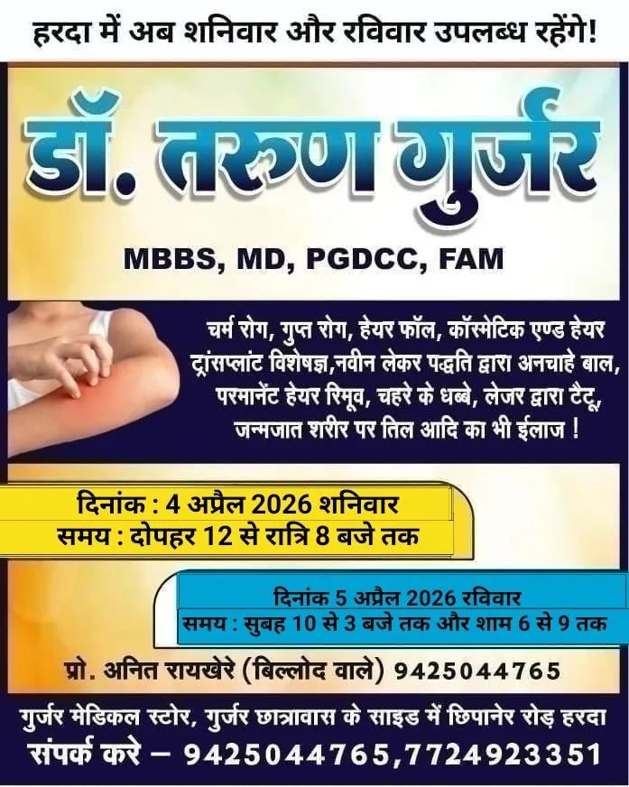 हरदा – इस बार शनिवार और रविवार 4 अप्रैल और 5 अप्रैल को हरदा में उपलब्ध रहेंगे चर्म रोग विशेषज्ञ डॉ. तरुण गुर्जर / गुर्जर मेडिकल स्टोर पर !