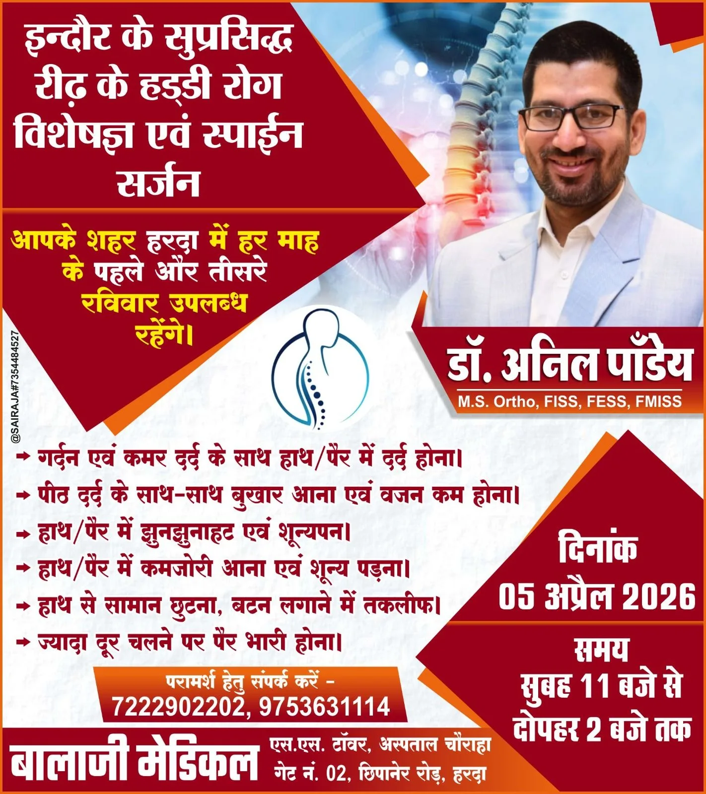हरदा – इन्दौर के सुप्रसिद्ध रीढ़ के हड्डी रोग विशेषज्ञ एवं स्पाईन सर्जन डॉक्टर अनिल पांडेय रविवार 5 अप्रैल को हरदा में उपलब्ध …!
