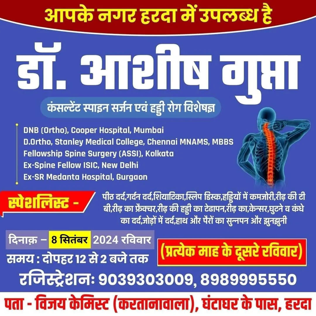 हरदा में दिनाँक 8 सितंबर 2024 रविवार समयः दोपहर 12 से 2 बजे तक (प्रत्येक माह के दूसरे रविवार) को कंसल्टेंट स्पाइन सर्जन एवं हड्डी रोग विशेषज्ञ डॉ. आशीष गुप्ता पधार रहे है जो DNB (Ortho), Cooper Hospital, Mumbai D.Ortho, Stanley Medical College, Chennai MNAMS, MBBS Fellowship Spine Surgery (ASSI), Kolkata Ex-Spine Fellow ISIC, New Delhi Ex-SR Medanta Hospital, Gurgaon जैसी संस्थाओं में सेवा दे चुके हैं!