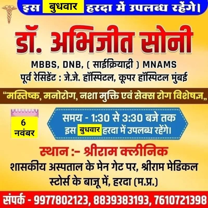 हरदा – मस्तिष्क, मानसिक रोग, नशा मुक्ति व सेक्स रोग विशेषज्ञ डॉ अभिजीत सोनी 6 नवंबर बुधवार को श्री राम मेडिकल पर उपलब्ध रहेगे !
