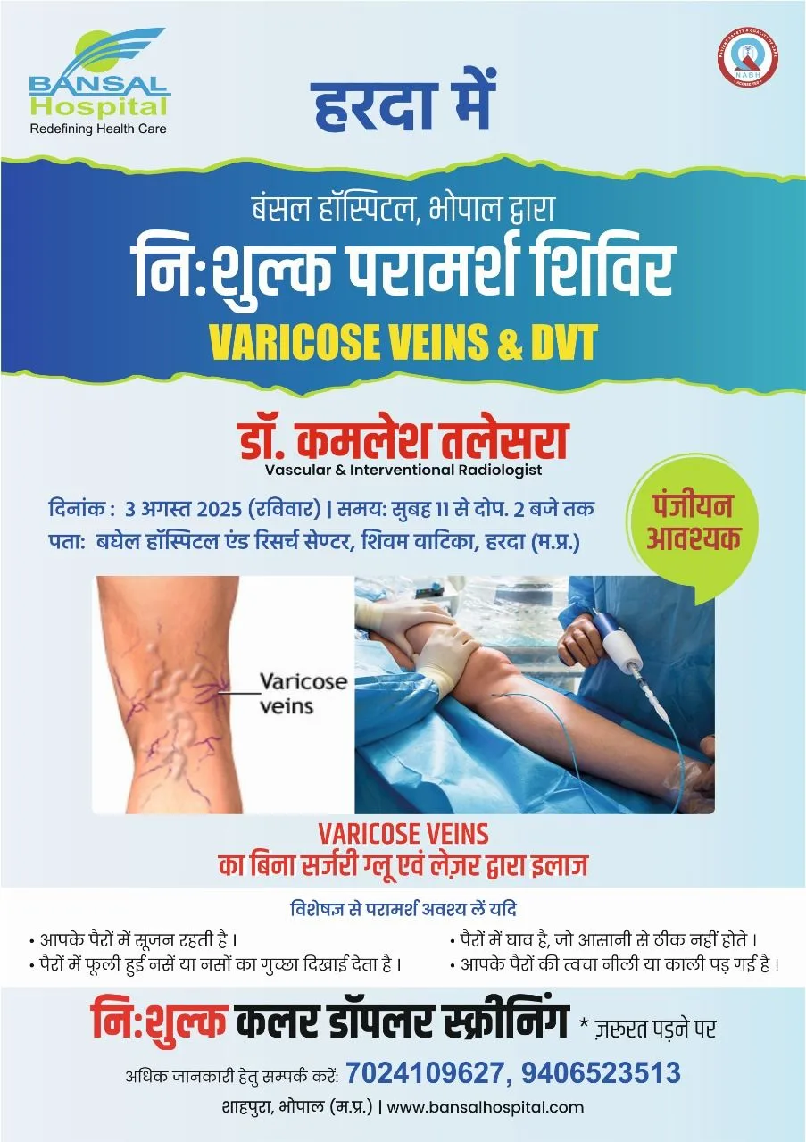 स्पेशल VARICOSE VEINS & DVT जैसी बीमारियों से जुड़े मरीजों के लिए डॉ. कमलेश तलेसरा Vascular & Interventional Radiologist हरदा में उपलब्ध रहेंगे !