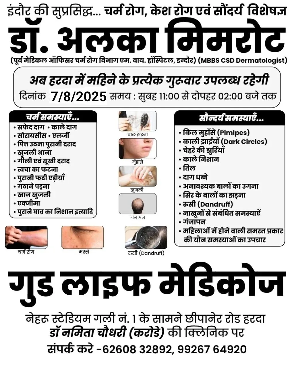 इंदौर की सुप्रसिद्ध… चर्म रोग, केश रोग एवं सौंदर्य विशेषज्ञ डॉ. अलका मिमरोट (पूर्व मेडिकल ऑफिसर चर्म रोग विभाग एम. वाय. हॉस्पिटल, इन्दौर) (MBBS CSD Dermatologist) अब हरदा में हर हफ्ते गुरुवार गुड लाईफ मेडिकोज हरदा पर उपलब्ध रहेंगे ! इस बार 7 अगस्त को उपलब्ध रहेगी !