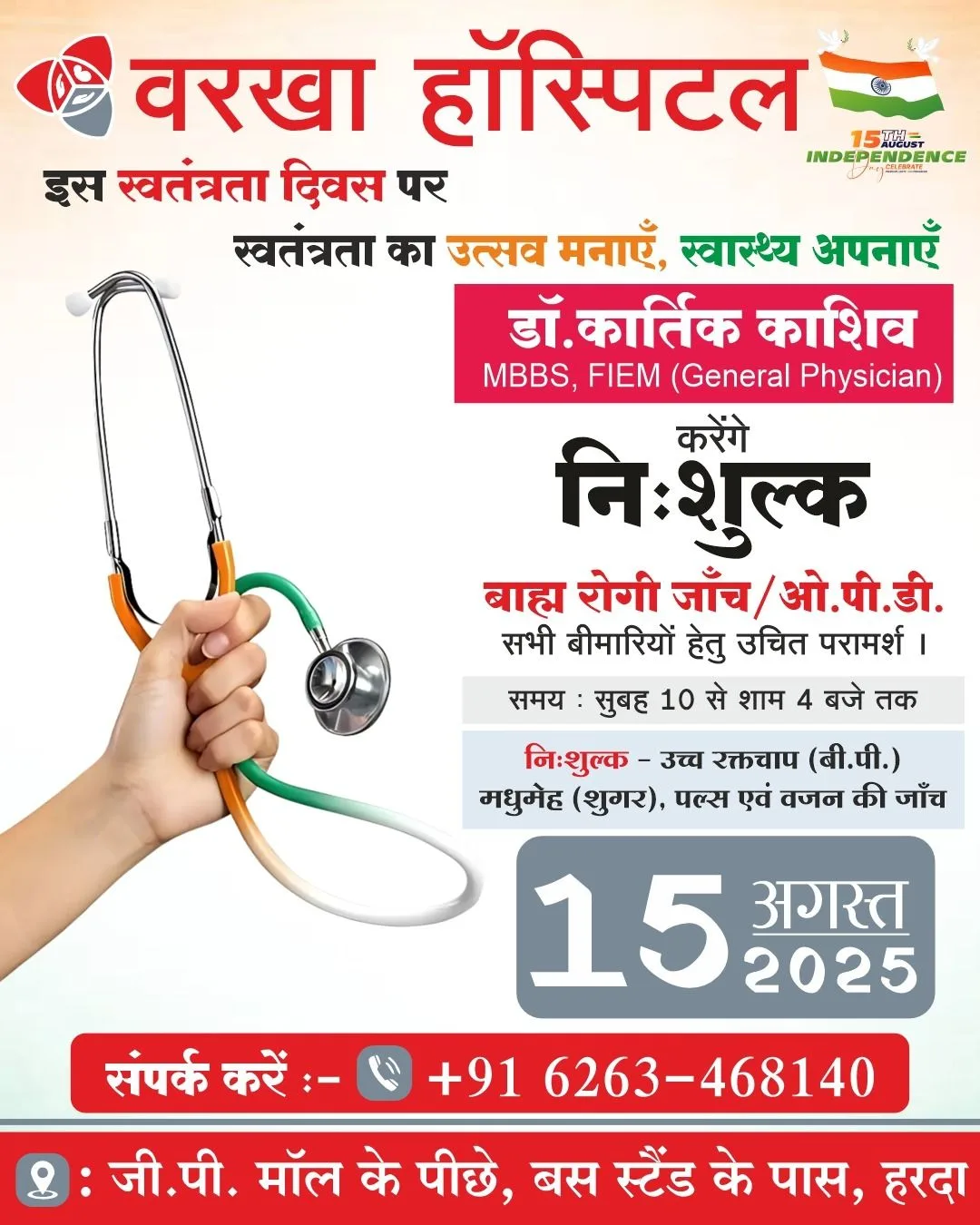 हरदा – वरखा हॉस्पिटल द्वारा 15 अगस्त शुक्रवार को स्वतंत्रता दिवस के उपलक्ष्य में निशुल्क कैंप का आयोजन !