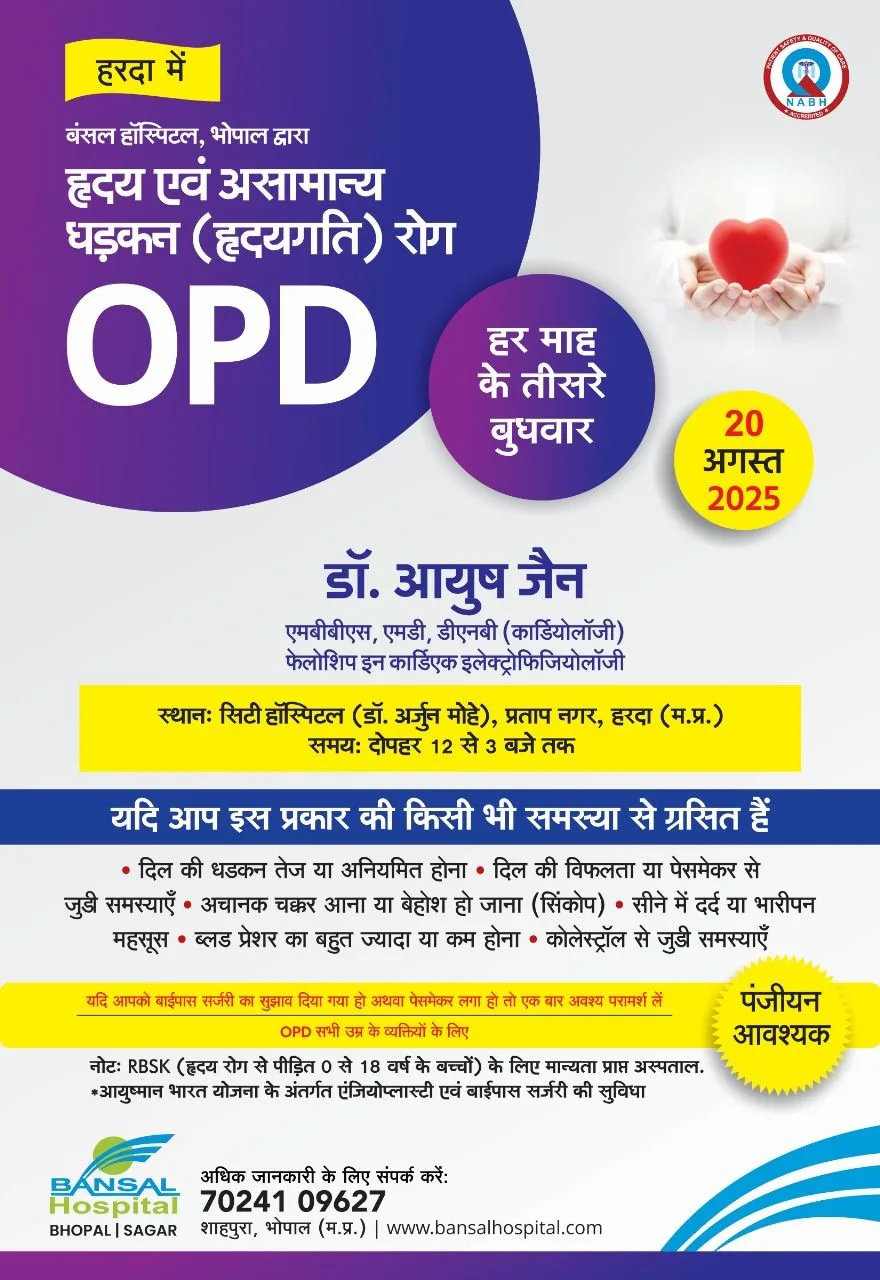 हरदा में बंसल हॉस्पिटल भोपाल द्वारा हरदा में एक दिवसीय परामर्श शिविर जिसमे हृदय एवं असामान्य धड़कन (हृदयगति) रोग से जुड़ी बीमारियों के लिए डॉ. आयुष जैन 20 अगस्त बुधवार को उपलब्ध रहेंगे जहां आप परामर्श ले सकेंगे !