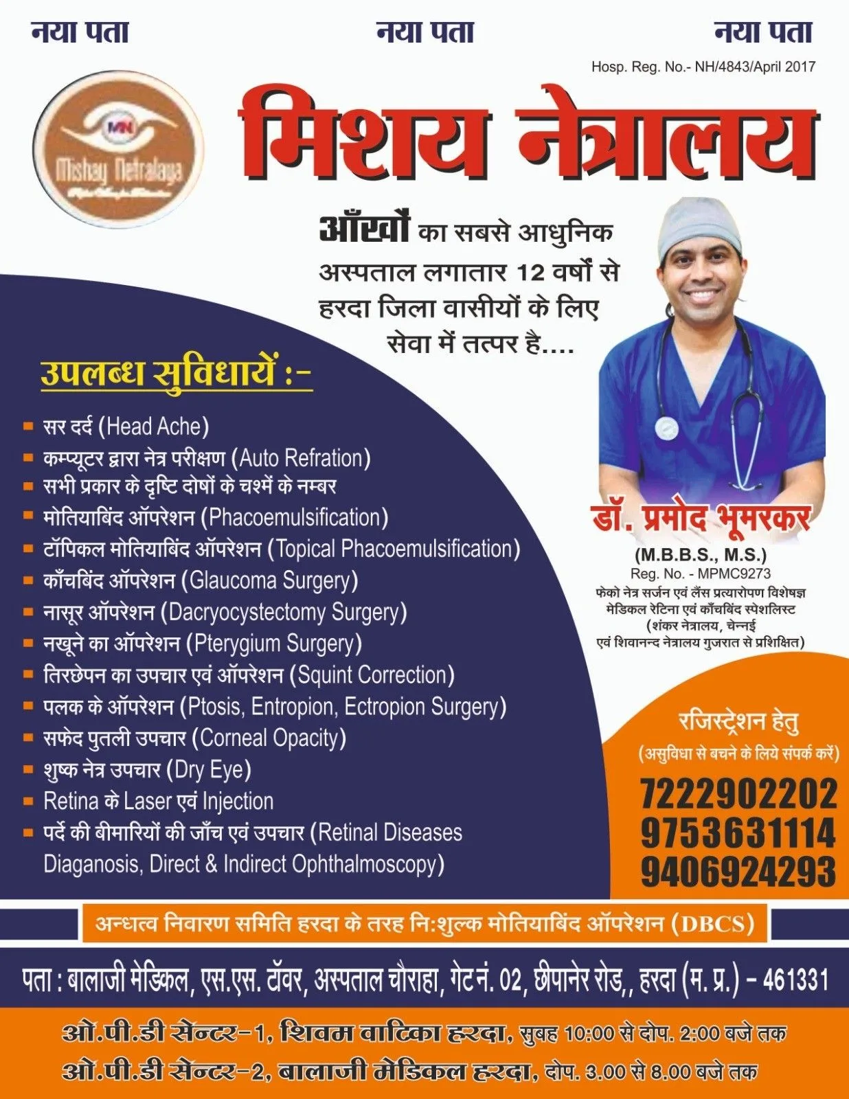 मिशय नेत्रालय हरदा आँखों का सबसे आधुनिक अस्पताल लगातार 12 वर्षों से हरदा जिला वासीयों के लिए सेवा में तत्पर है अब नए पते पर भी आपको मिलेगी सेवाएं दोपहर 3 से रात्रि 8 बजे तक !