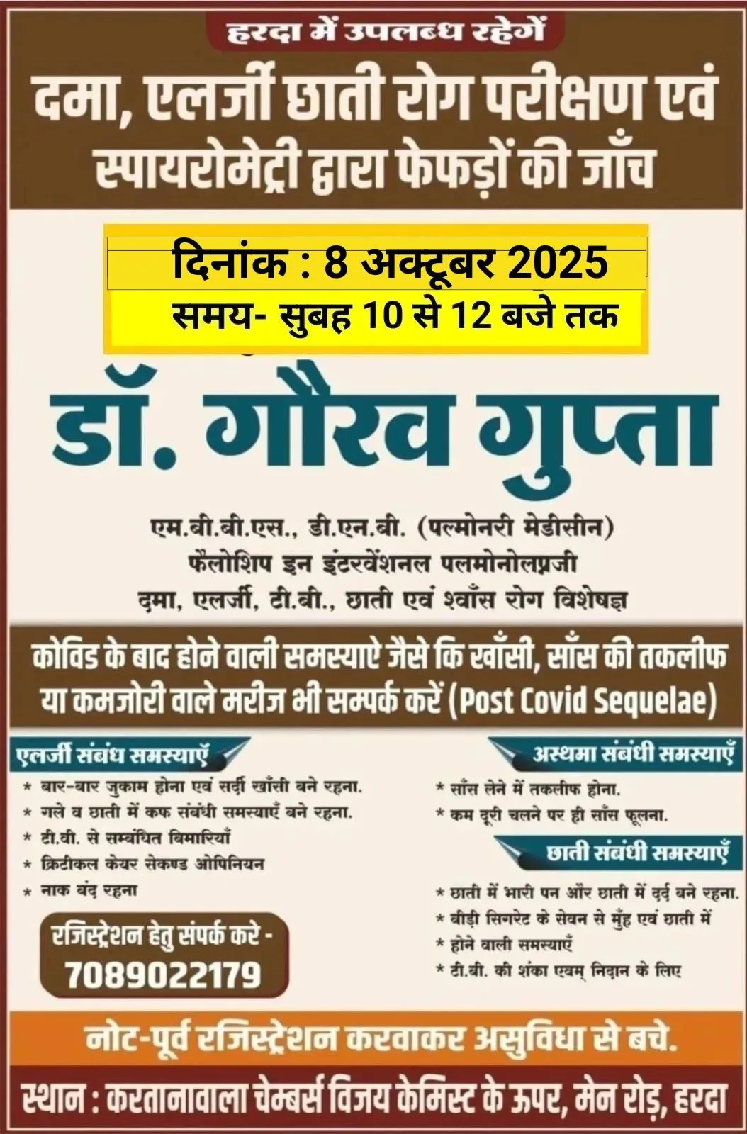 हरदा में विजय केमिस्ट करताना वाला चैंबर पर दमा,एलर्जी छाती रोग परीक्षण एवं स्पायरोमेट्री द्वारा फेफड़ों की जाँच 8 अक्टूबर को !