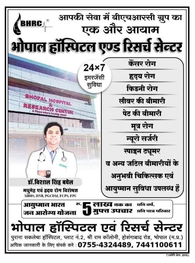 आपकी सेवा में BHRC ग्रुप का एक और आयाम भोपाल हॉस्पिटल एण्ड रिसर्च सेन्टर जहा सर्व सुविधा युक्त आधुनिक मशीनों से सुसज्जित उपचार विशेष डॉक्टरों की टीम द्वारा किया जाता है जिसमे सरकार द्वारा संचालित आयुष्मान भारत जन आरोग्य योजना 5 लाख ₹ तक मुफ्त उपचार प्रति पात्र परिवार प्रति वर्ष तक की सुविधा भी उपलब्ध है वही अब भोपाल हॉस्पिटल एवं रिसर्च सेंटर भोपाल में अब किडनी की पथरी तथा प्रोस्टेट का आपरेशन आयुष्मान योजना अंतर्गत निःशुल्क अनुभवी चिकित्सकों द्वारा सुविधा शुरू हो गई है जिसमे आप आसानी से ईलाज करा सकेगे