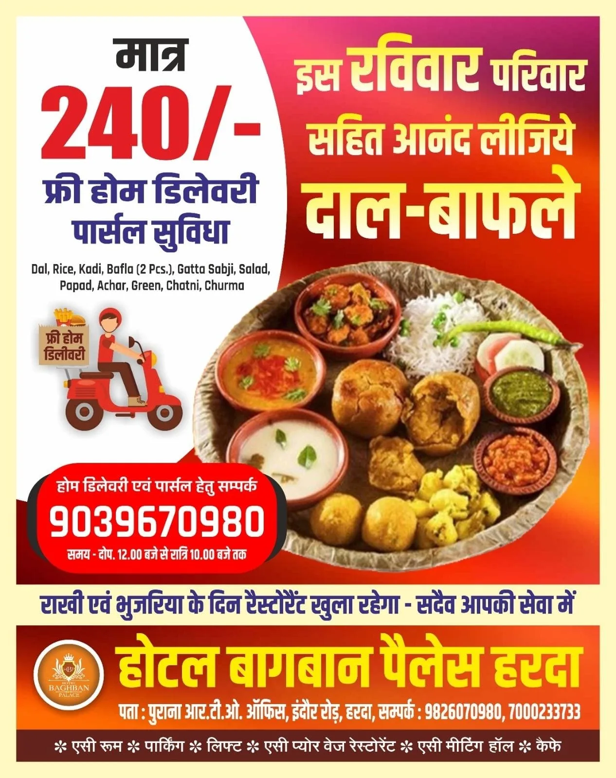 हरदा शहर में आप अब अपने मालवा निमाड़ का खास व्यंजन दाल बाफले होटल बागबान पर इस रविवार पर उपलब्ध रहेंगे ऑर्डर बुक करे और होम डिलेवरी सुविधा का लाभ भी उठाए !