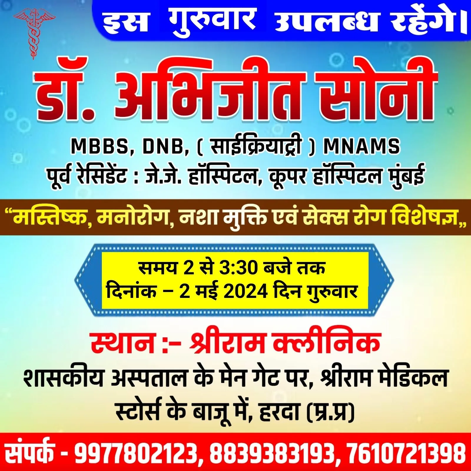 हरदा – मस्तिष्क, मानसिक रोग, नशा मुक्ति व सेक्स रोग विशेषज्ञ डॉ अभिजीत सोनी 2 मई गुरुवार को श्री राम मेडिकल पर उपलब्ध रहेगे !