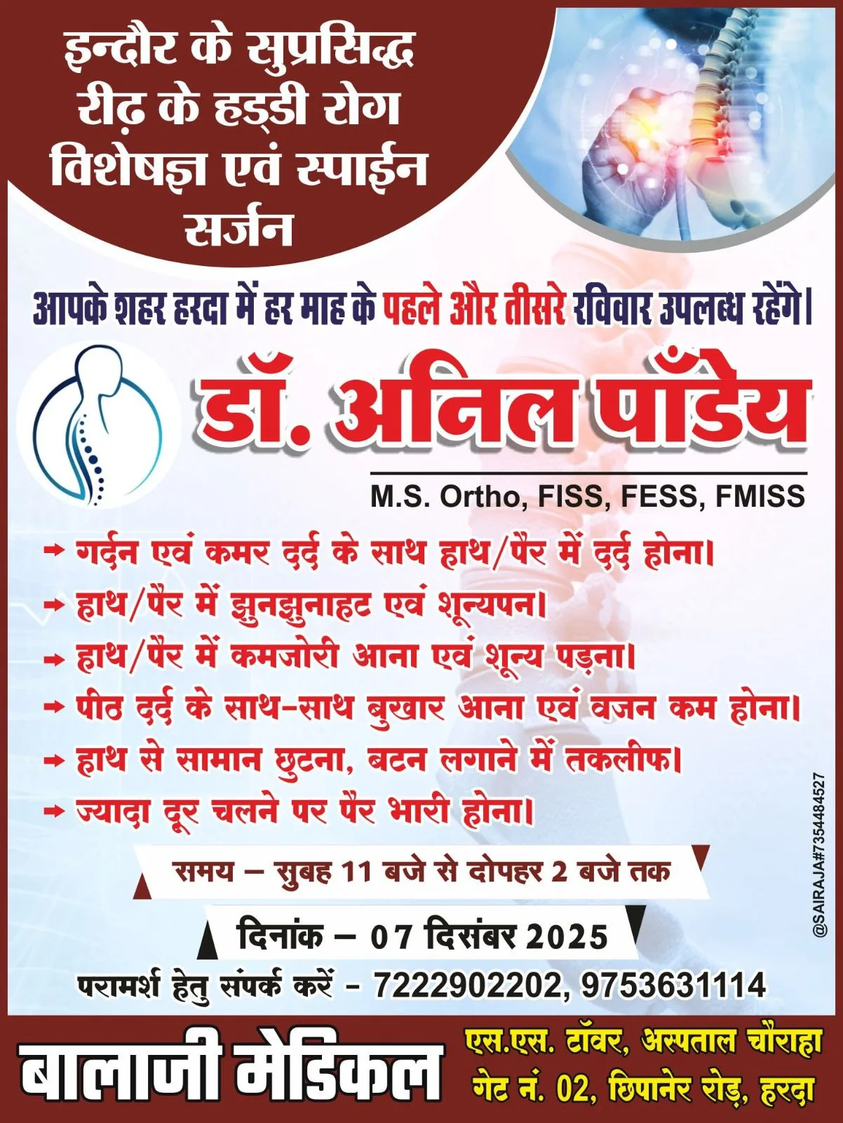 हरदा – इन्दौर के सुप्रसिद्ध रीढ़ के हड्डी रोग विशेषज्ञ एवं स्पाईन सर्जन डॉक्टर अनिल पांडेय 7 दिसंबर को हरदा में उपलब्ध …!