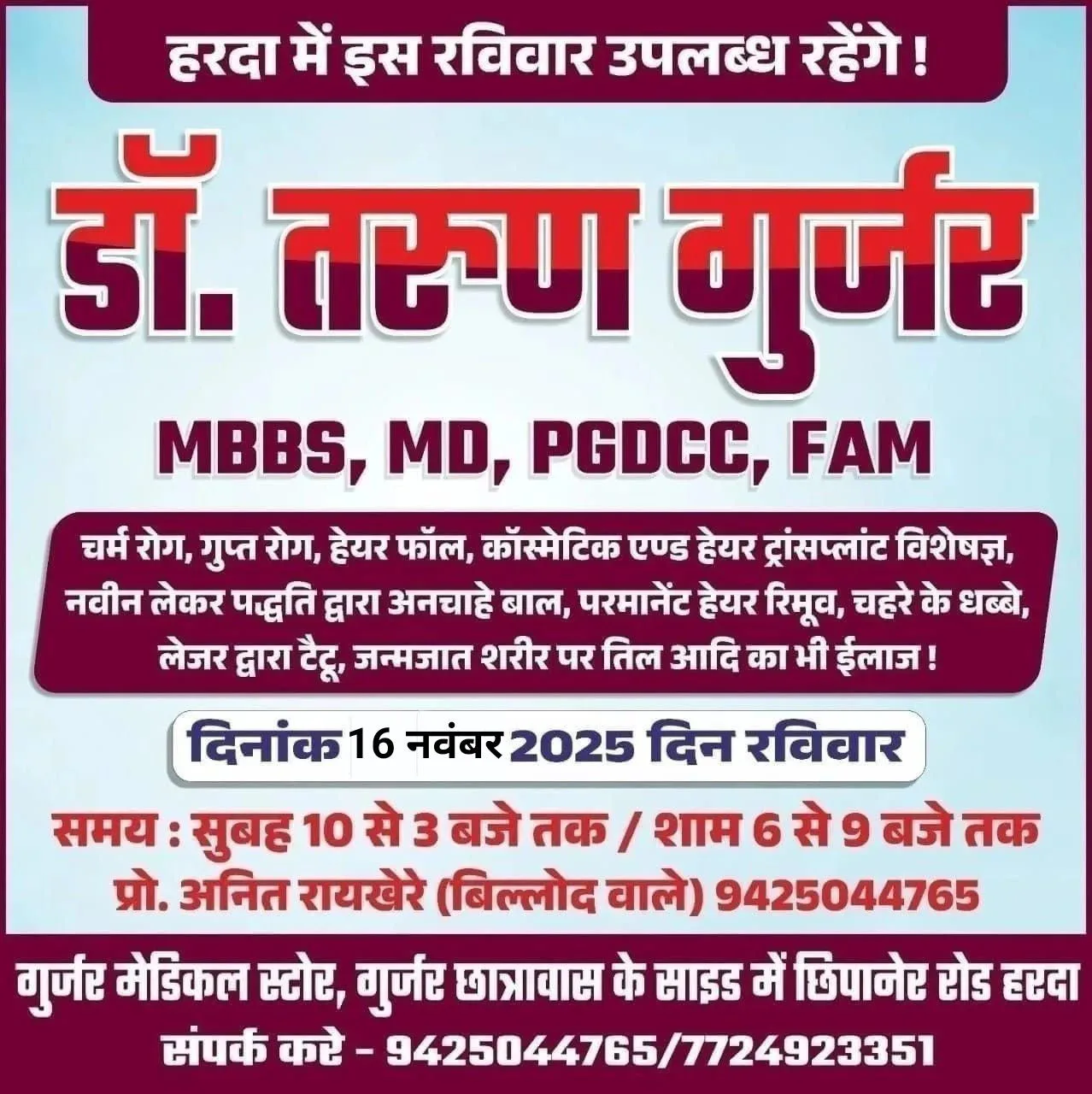 हरदा – इस बार रविवार 16 नवंबर को हरदा में उपलब्ध रहेंगे चर्म रोग विशेषज्ञ डॉ. तरुण गुर्जर मेडिकल स्टोर पर !