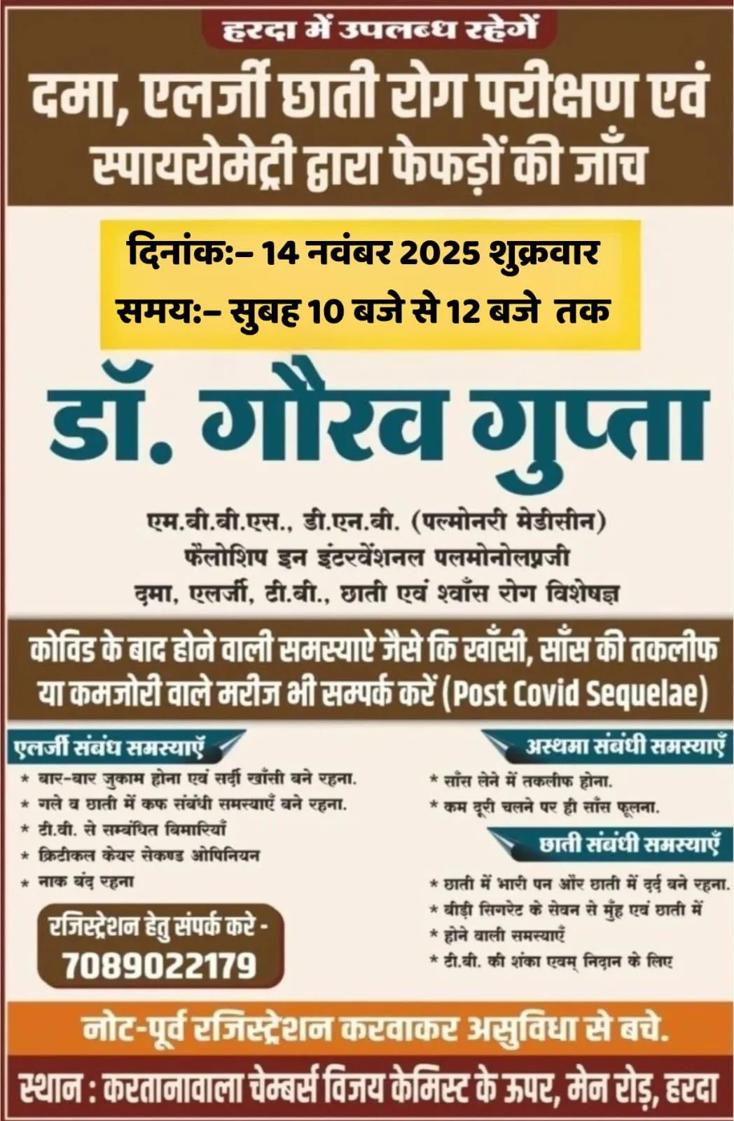 हरदा में विजय केमिस्ट करताना वाला चैंबर पर दमा,एलर्जी छाती रोग परीक्षण एवं स्पायरोमेट्री द्वारा फेफड़ों की जाँच 14 नवंबर को !
