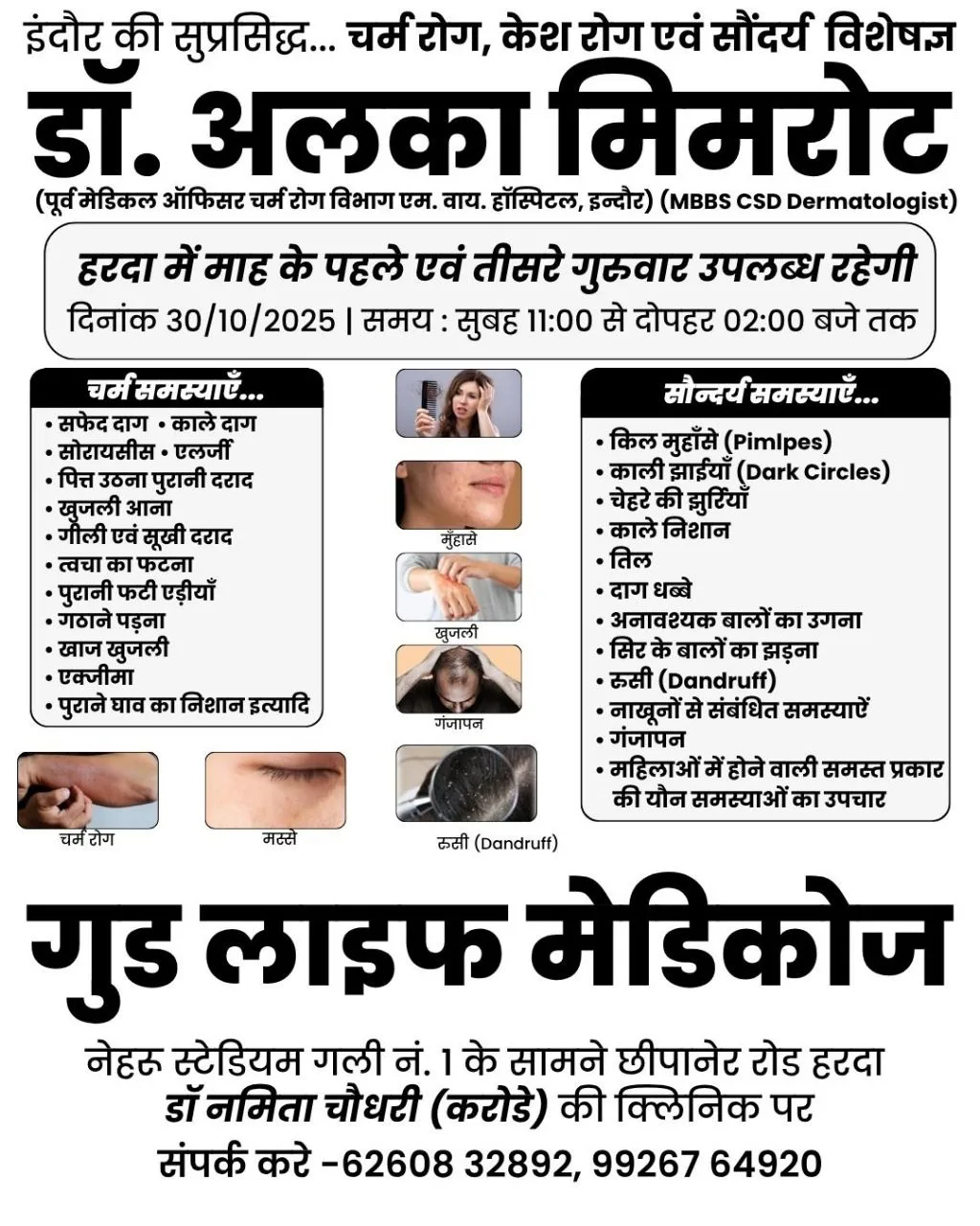 हरदा – इस बार रविवार 26 अक्टूबर को हरदा में उपलब्ध रहेंगे चर्म रोग विशेषज्ञ डॉ. तरुण गुर्जर मेडिकल स्टोर पर !