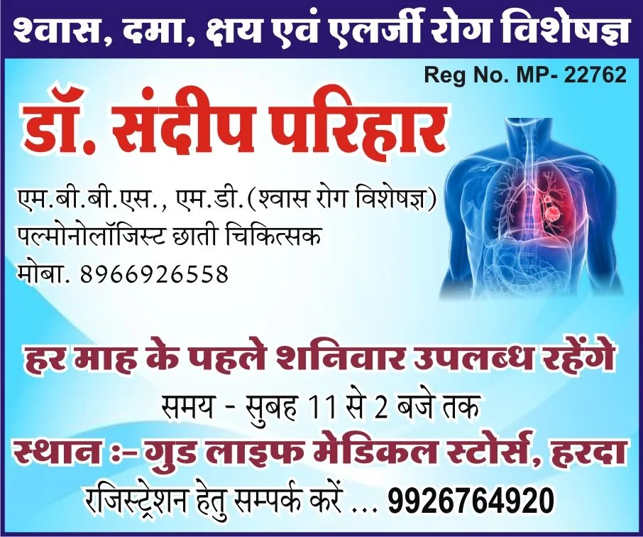 हरदा : शनिवार 1 नवंबर को श्वास, दमा, क्षय एवं एलर्जी रोग विशेषज्ञ डॉक्टर संदीप परिहार हरदा में उपलब्ध रहेंगे !