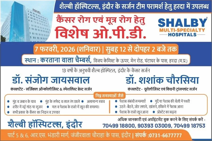 हरदा – शैल्बी मल्टी स्पेशल हॉस्पिटल्स, इंदौर के सर्जन टीम परामर्श हेतु हरदा में उपलब्ध 7 फरवरी शनिवार को करताना वाला चेम्बर्स में उपलब्ध