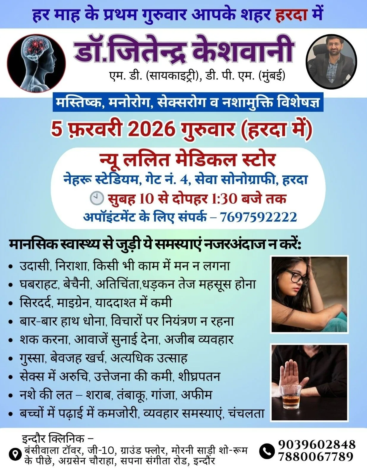 हरदा : 5 फरवरी गुरुवार को मस्तिष्क, मनोरोग, सेक्सरोग व नशामुक्ति विशेषज्ञ डॉक्टर हरदा में उपलब्ध रहेंगे !