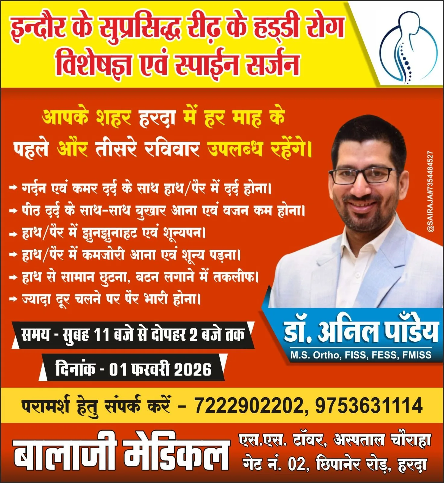 हरदा – इन्दौर के सुप्रसिद्ध रीढ़ के हड्डी रोग विशेषज्ञ एवं स्पाईन सर्जन डॉक्टर अनिल पांडेय 1 फरवरी को हरदा में उपलब्ध …!