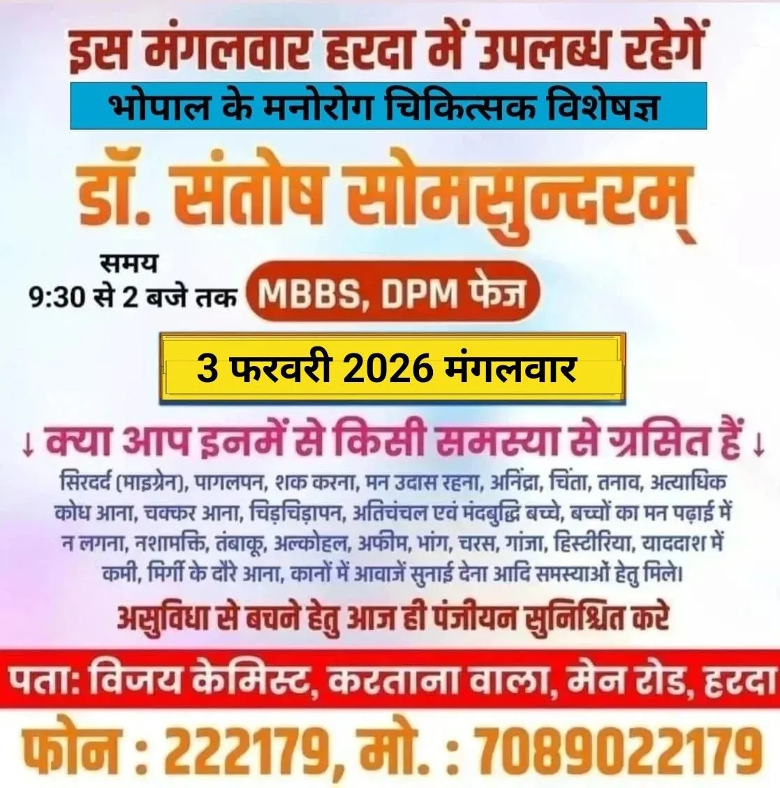 Blog हरदा – मनोरोग चिकित्सक विशेषज्ञ डॉ. संतोष सोमसुन्दरम मंगलवार 3 फरवरी हरदा में उपलब्ध ! February 2, 2026 No Comments