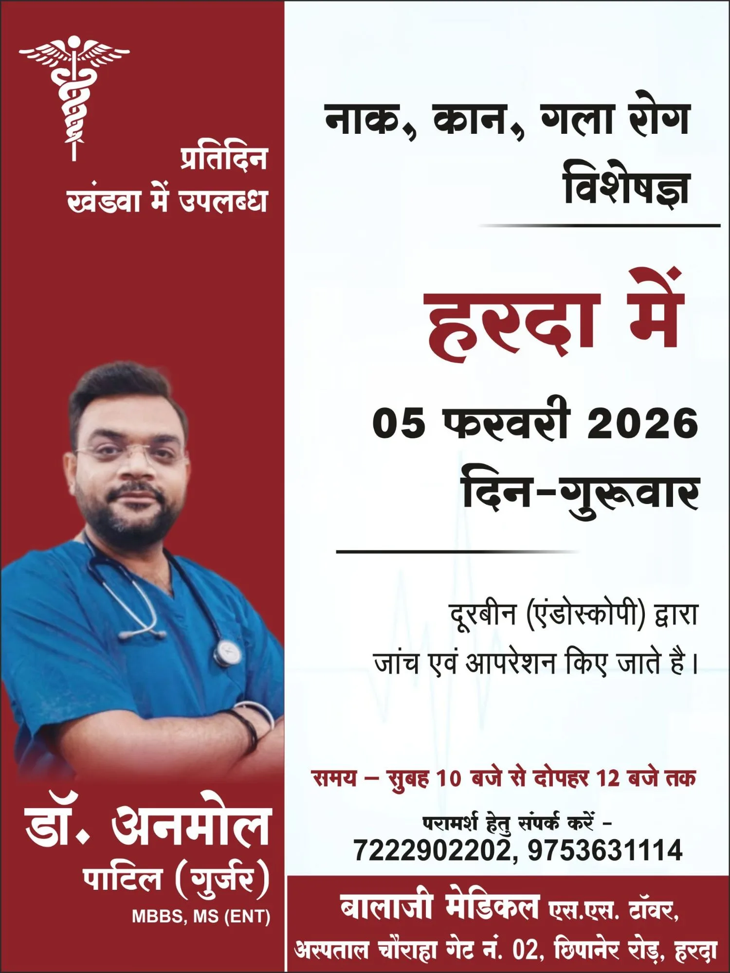– नाक, कान, गला एवं कैंसर रोग विशेषज्ञ डॉ. अनमोल पाटिल गुर्जर इस रविवार बालाजी मेडिकल पर 5 फरवरी गुरुवार को उपलब्ध रहेंगे !