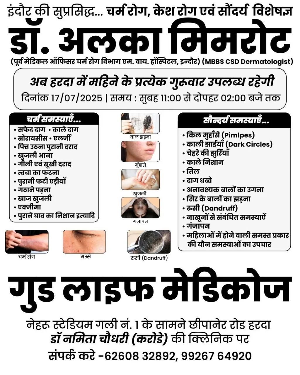 हरदा – इस बार रविवार 20 जुलाई को हरदा में उपलब्ध रहेंगे चर्म रोग विशेषज्ञ डॉ. तरुण गुर्जर मेडिकल स्टोर पर !