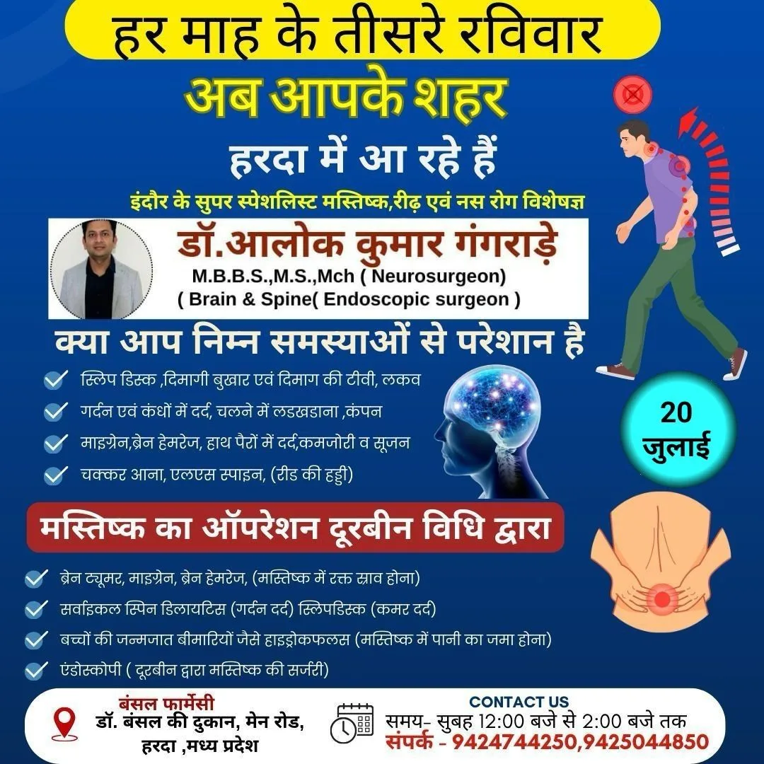 Blog हरदा – न्यूरो सर्जन डॉ आलोक कुमार गंगराड़े इस रविवार 20 जुलाई को बंसल फार्मेसी पर उपलब्ध रहेंगे ! July 18, 2025 No Comments