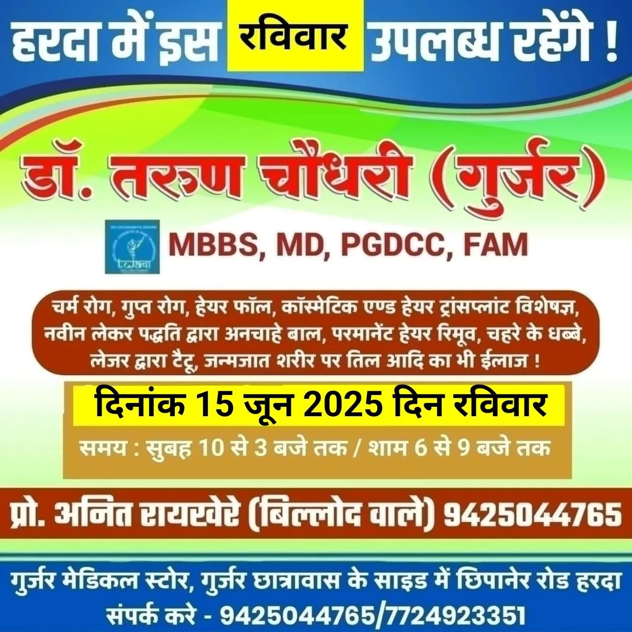 हरदा – इस बार रविवार 15 जून को हरदा में उपलब्ध रहेंगे चर्म रोग विशेषज्ञ डॉ. तरुण गुर्जर मेडिकल स्टोर पर !