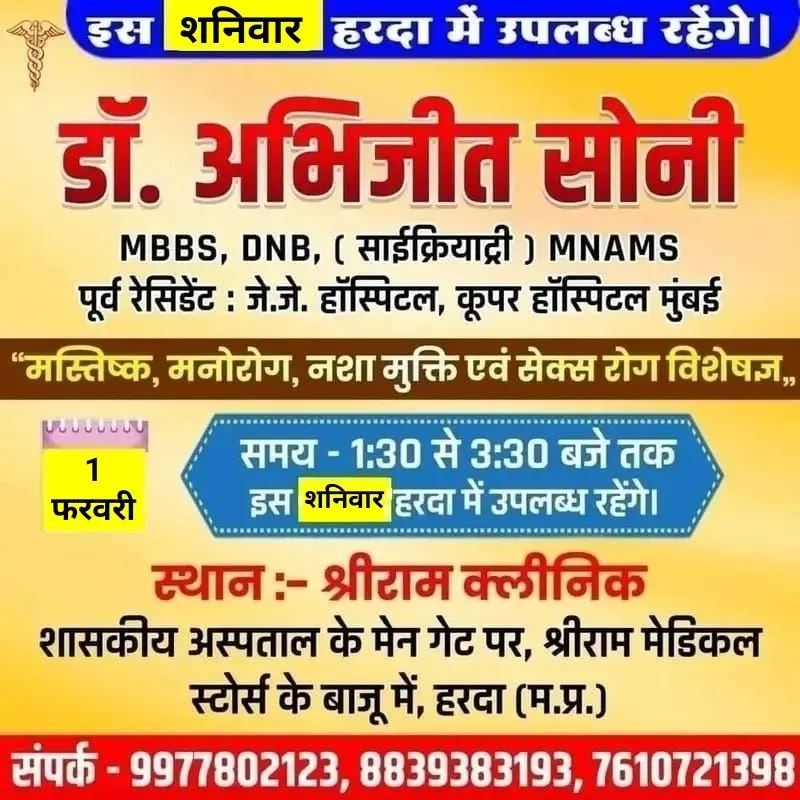 हरदा – मस्तिष्क, मानसिक रोग, नशा मुक्ति व सेक्स रोग विशेषज्ञ डॉ अभिजीत सोनी 1 फरवरी शनिवार को श्री राम मेडिकल पर उपलब्ध रहेगे !
