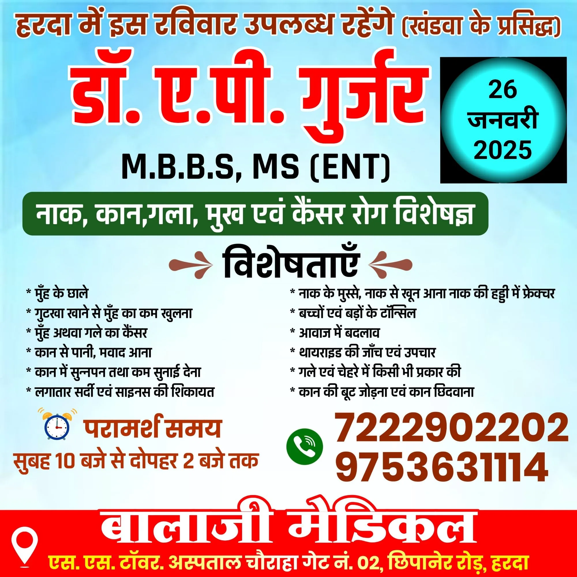 हरदा – नाक, कान, गला एवं कैंसर रोग विशेषज्ञ डॉ. ए.पी. गुर्जर इस रविवार बालाजी मेडिकल पर 26 जनवरी को उपलब्ध रहेंगे !