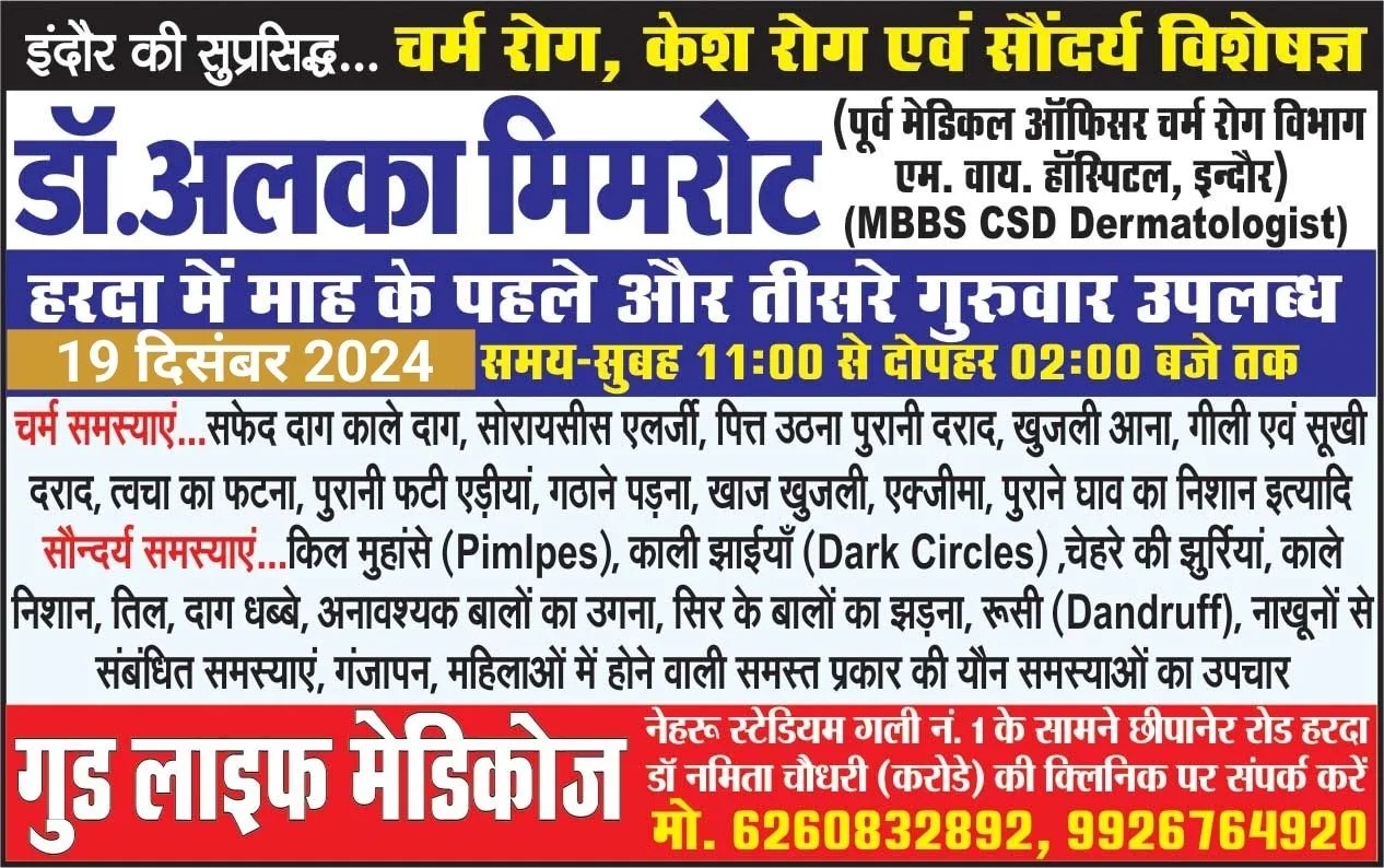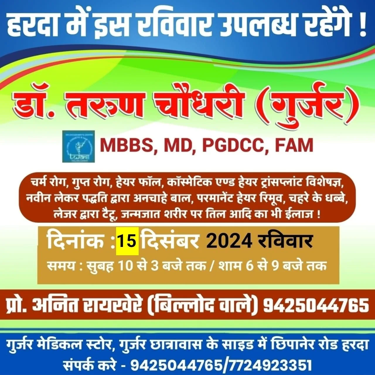 हरदा – इस रविवार 15 दिसंबर को हरदा में उपलब्ध रहेंगे चर्म रोग विशेषज्ञ डॉ. तरुण चौधरी (गुर्जर) गुर्जर मेडिकल स्टोर पर !