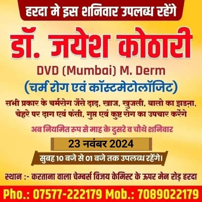 हरदा – चर्म रोग विशेषज्ञ डॉ जयेश कोठारी इस शनिवार परामर्श हेतु 23 नवंबर को करताना वाला चेम्बर में उपलब्ध रहेंगे !