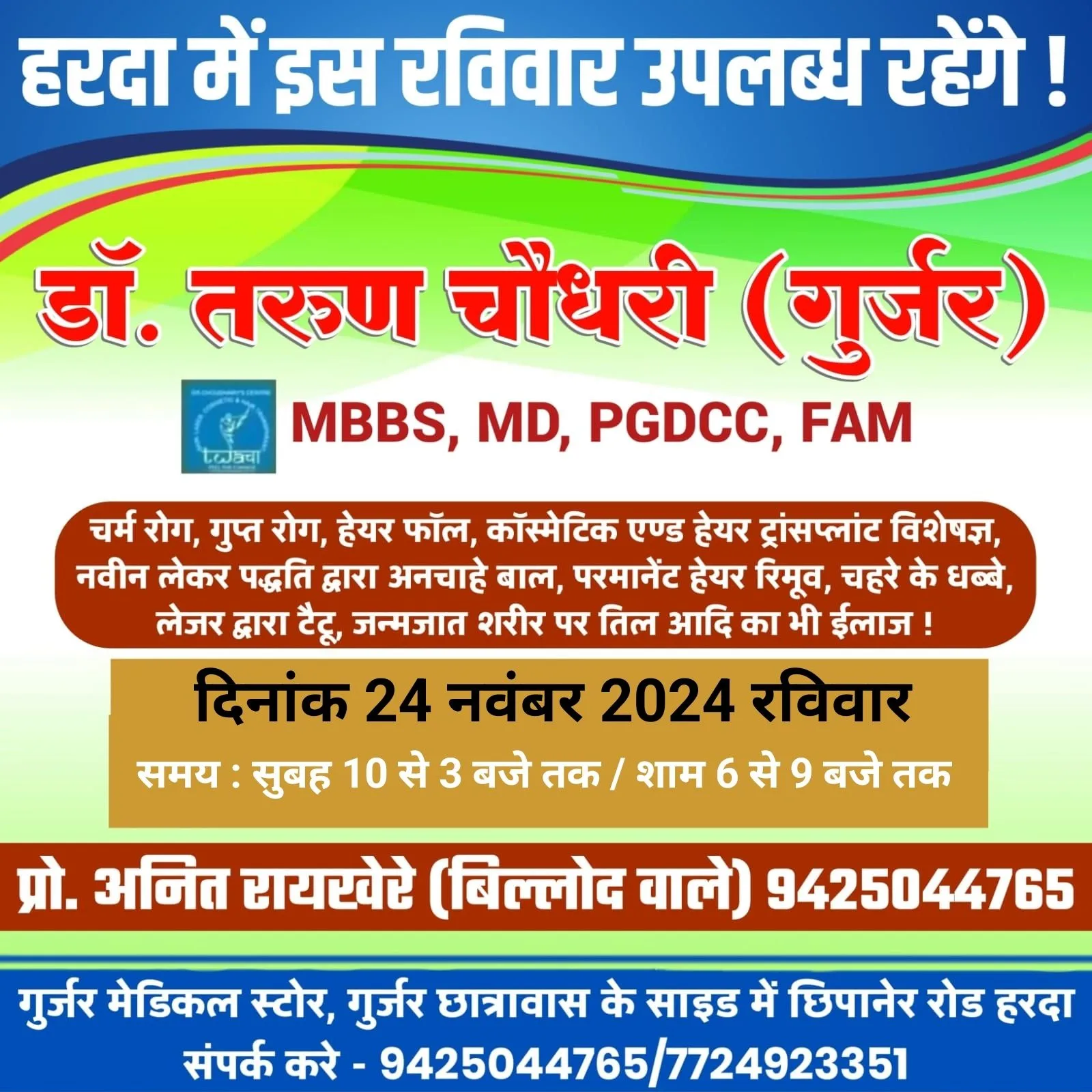 हरदा – इस बार इस रविवार 24 नवंबर को हरदा में उपलब्ध रहेंगे चर्म रोग विशेषज्ञ डॉ. तरुण चौधरी (गुर्जर) गुर्जर मेडिकल स्टोर पर !
