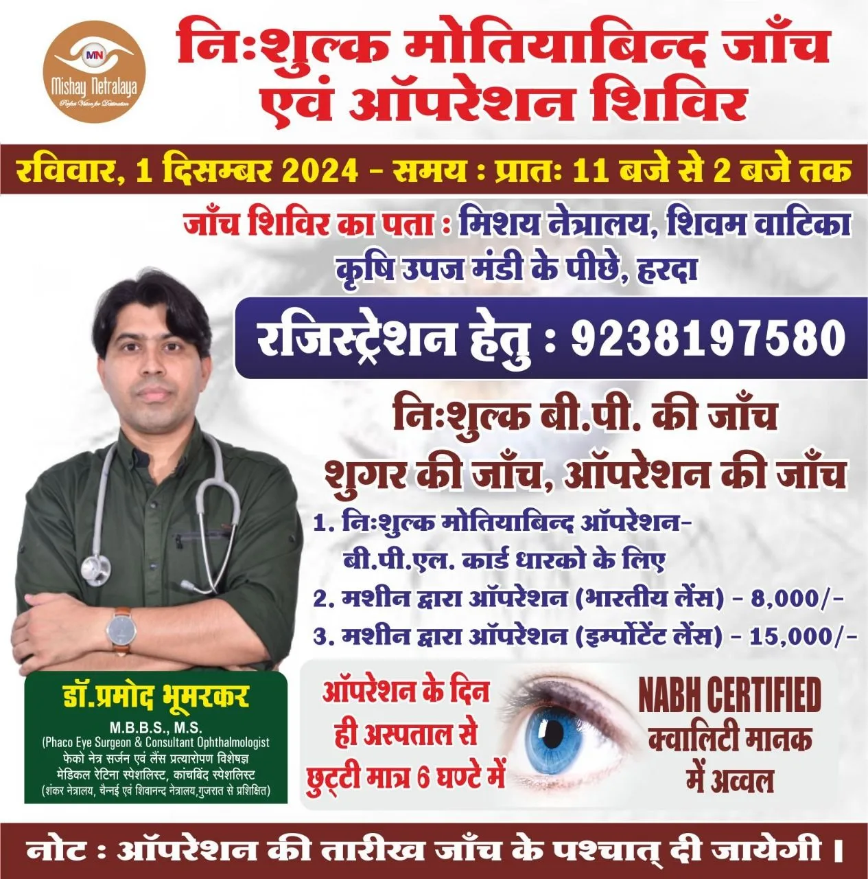 Blog हरदा में निःशुल्क मोतियाबिन्द जाँच एवं ऑपरेशन शिविर का आयोजन मिशय नेत्रालय द्वारा 1 दिसंबर को ! November 30, 2024 No Comments