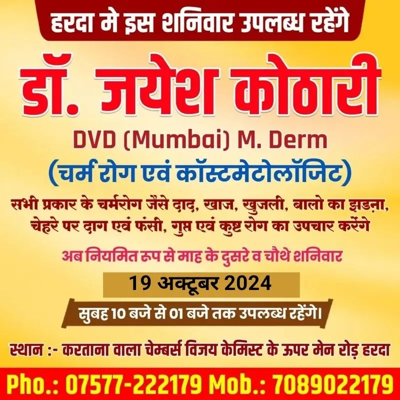 हरदा – चर्म रोग विशेषज्ञ डॉ जयेश कोठारी इस शनिवार परामर्श हेतु 19 अक्टूबर को करताना वाला चेम्बर में उपलब्ध रहेंगे !