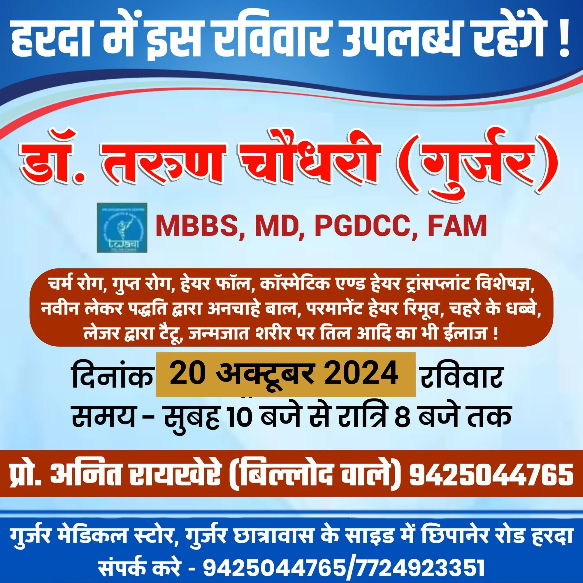 हरदा – इस बार इस रविवार 20 अक्टूबर को हरदा में उपलब्ध रहेंगे चर्म रोग विशेषज्ञ डॉ. तरुण चौधरी (गुर्जर) गुर्जर मेडिकल स्टोर पर !