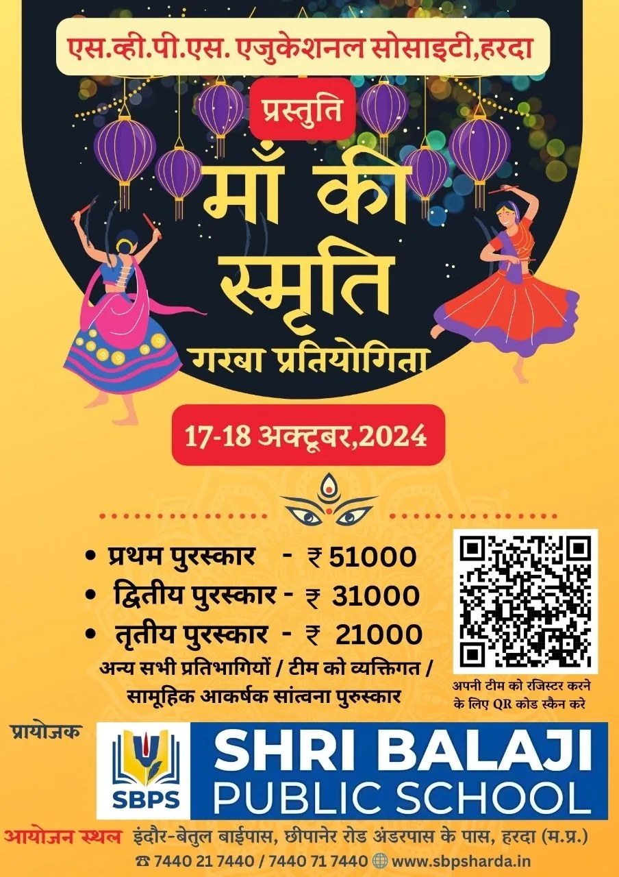 हरदा – 2 दिवसीय गरबा प्रतियोगिता 17 व 18 अक्टूबर को ईनाम 51 हजार ₹ ! 8 एकड़ के श्री बालाजी पब्लिक स्कूल कैंपस में आयोजित होगा !
