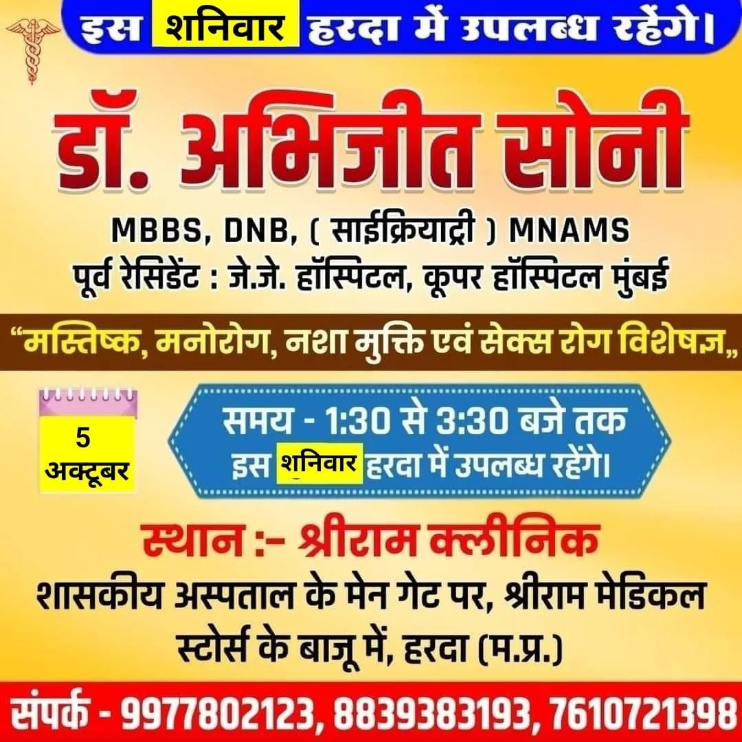हरदा – मस्तिष्क, मानसिक रोग, नशा मुक्ति व सेक्स रोग विशेषज्ञ डॉ अभिजीत सोनी 5 अक्टूबर शनिवार को श्री राम मेडिकल पर उपलब्ध रहेगे !