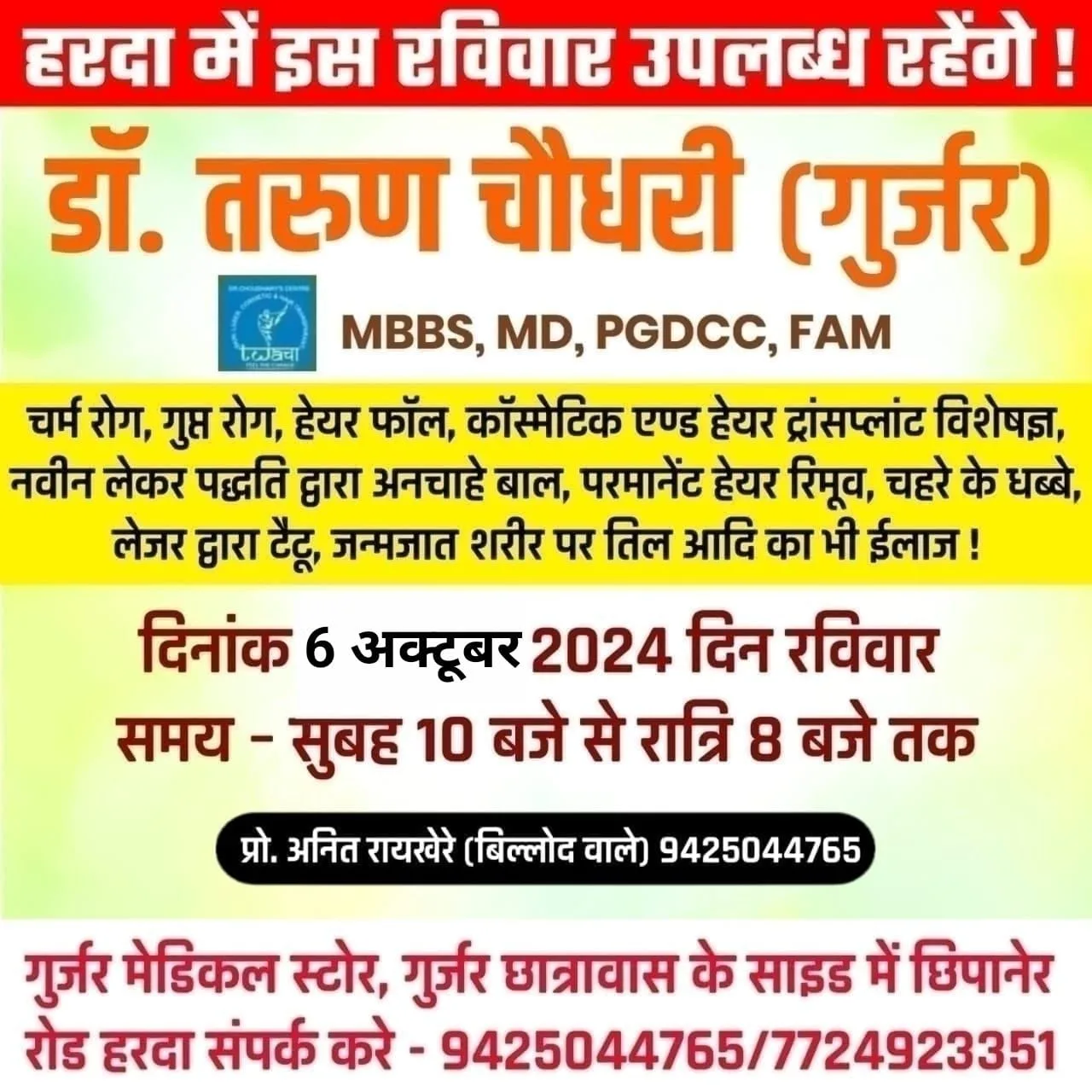 हरदा – इस बार इस रविवार 6 अक्टूबर को हरदा में उपलब्ध रहेंगे चर्म रोग विशेषज्ञ डॉ. तरुण चौधरी (गुर्जर) गुर्जर मेडिकल स्टोर पर !