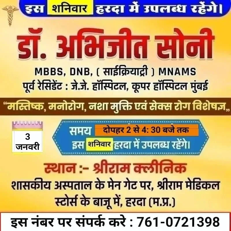 हरदा – मस्तिष्क, मानसिक रोग, नशा मुक्ति व सेक्स रोग विशेषज्ञ डॉ अभिजीत सोनी 3 जनवरी शनिवार को श्री राम मेडिकल पर उपलब्ध रहेगे !