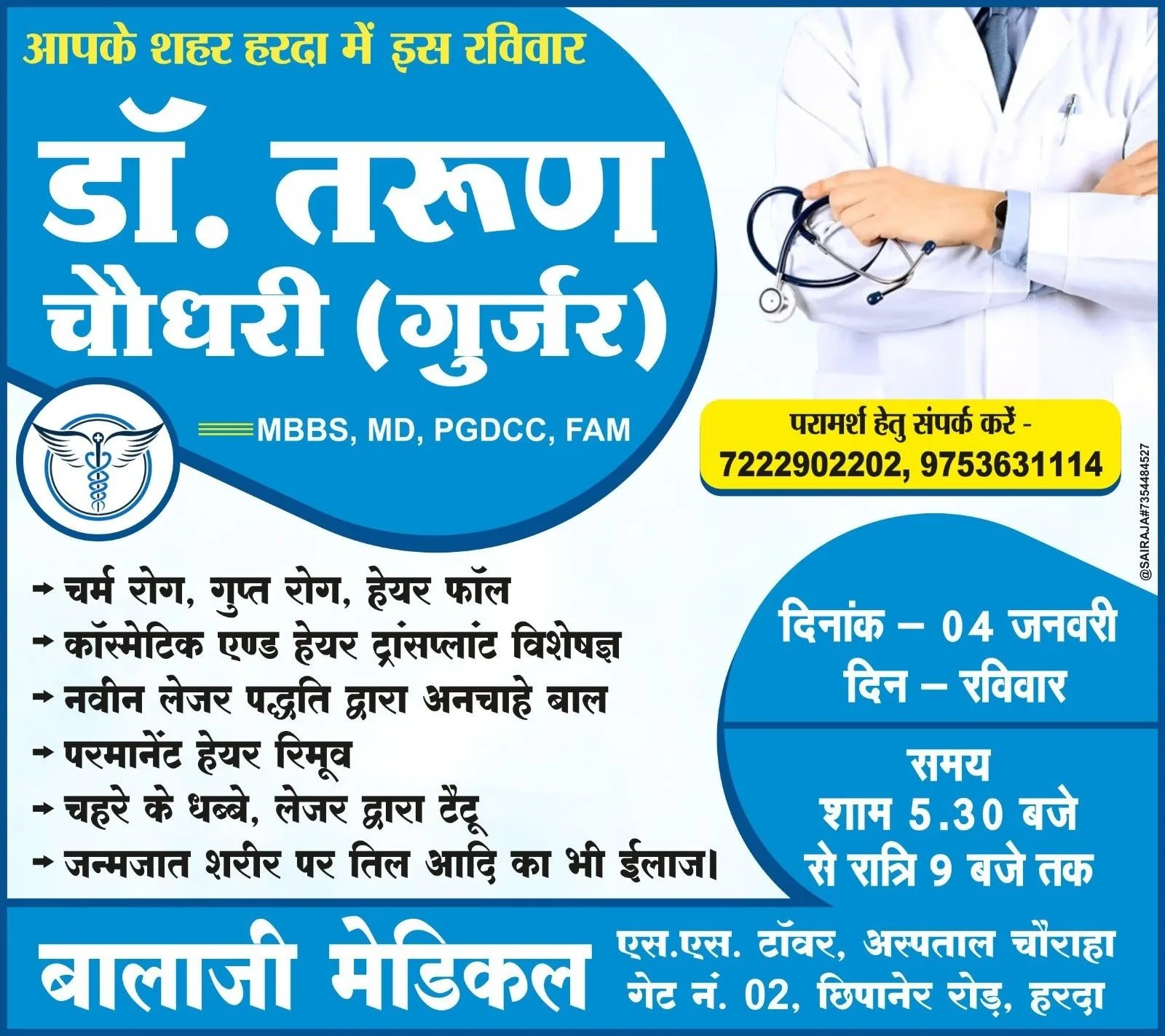 हरदा – इस बार शनिवार और रविवार 03/04 जनवरी को हरदा में उपलब्ध रहेंगे चर्म रोग विशेषज्ञ डॉ. तरुण गुर्जर / गुर्जर मेडिकल स्टोर पर !