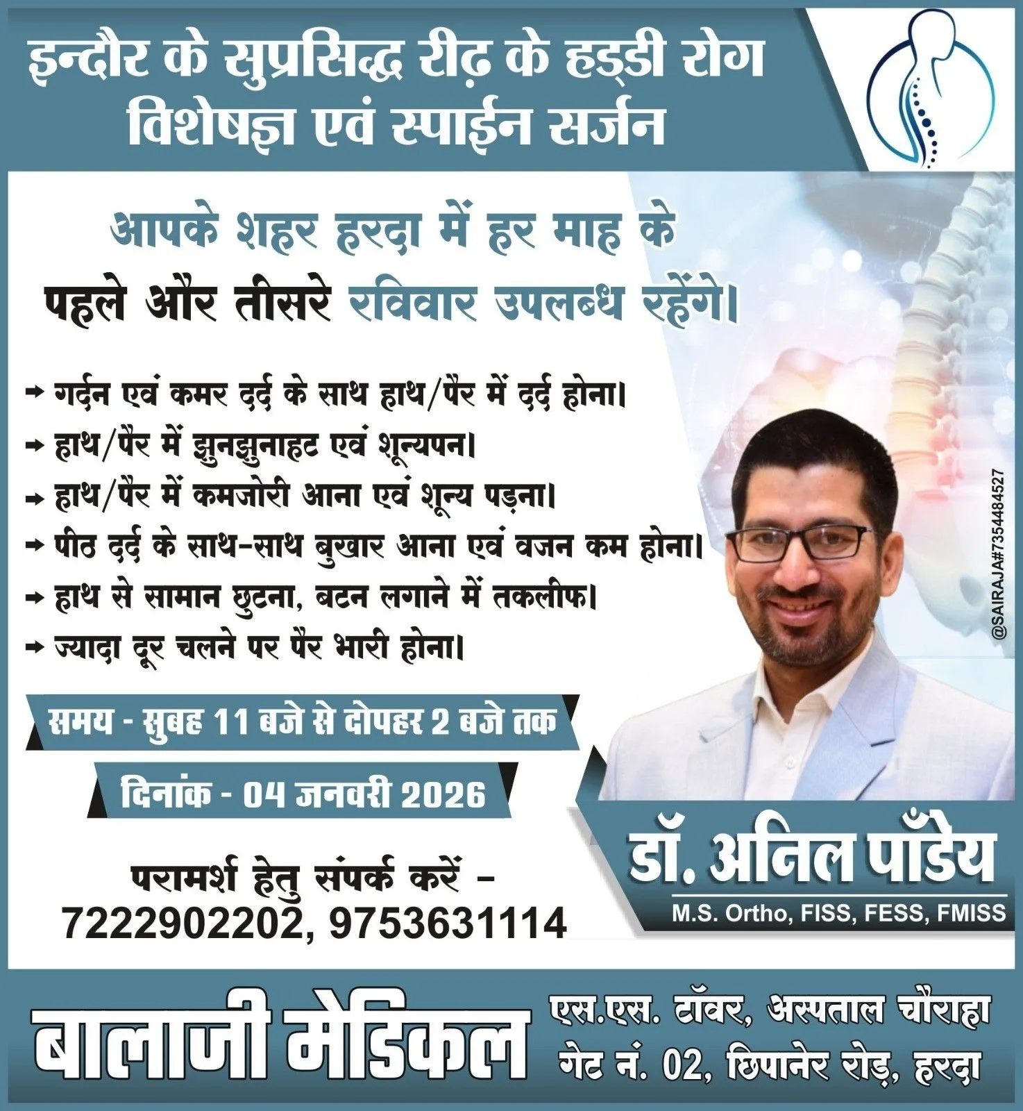 हरदा – इन्दौर के सुप्रसिद्ध रीढ़ के हड्डी रोग विशेषज्ञ एवं स्पाईन सर्जन डॉक्टर अनिल पांडेय 4 जनवरी को हरदा में उपलब्ध …!