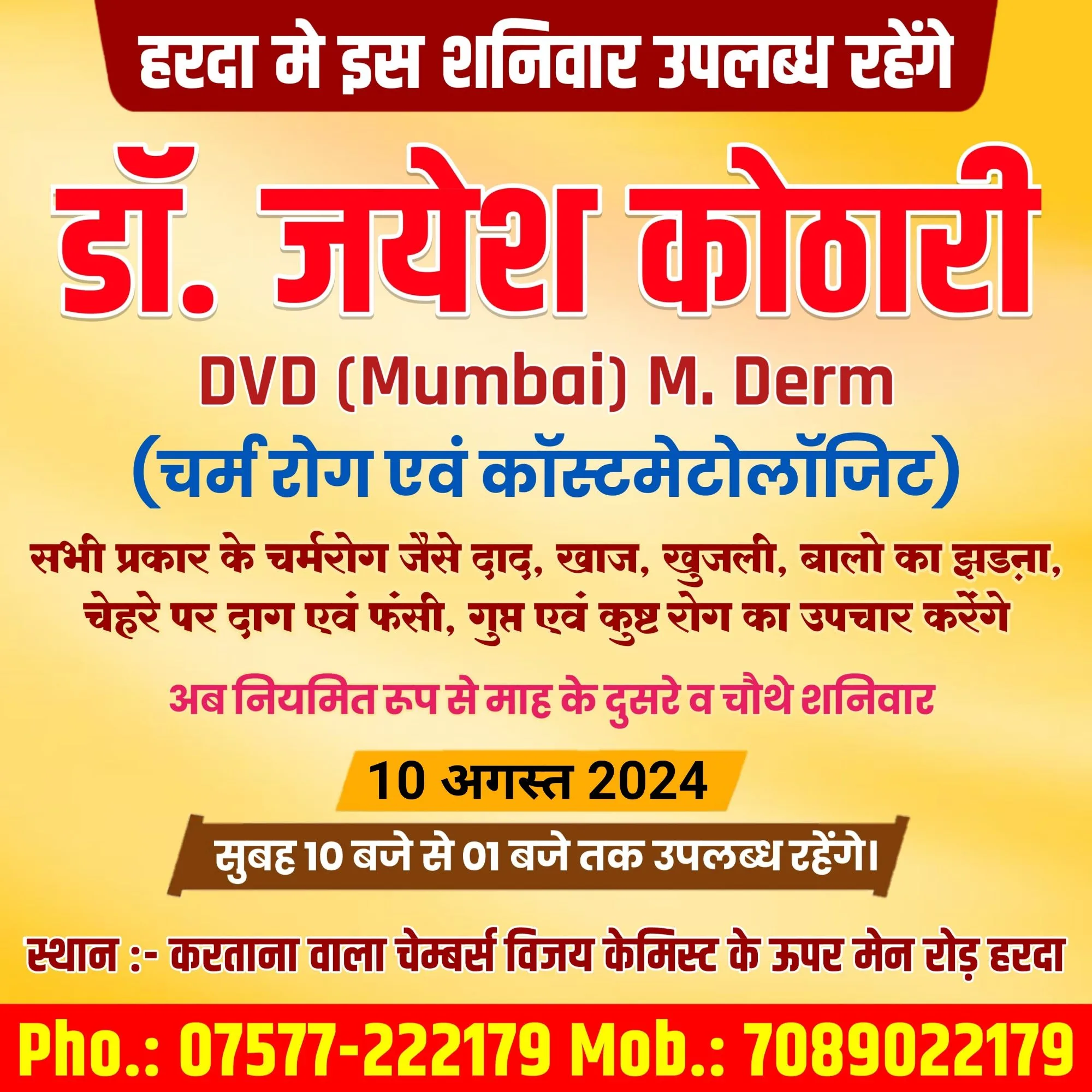 हरदा – चर्म रोग विशेषज्ञ डॉ जयेश कोठारी इस शनिवार परामर्श हेतु 10 अगस्त को करताना वाला चेम्बर में उपलब्ध रहेंगे !
