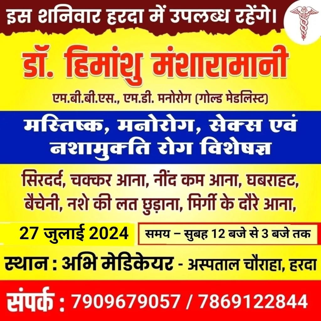 हरदा – 27 जुलाई शनिवार अभि मेडिकेयर पर मस्तिष्क, मनोरोग, सेक्स,एवं नशामुक्ति रोग विशेषज्ञ डॉ हिमांशु मंशारामानी उपलब्ध रहेंगे!