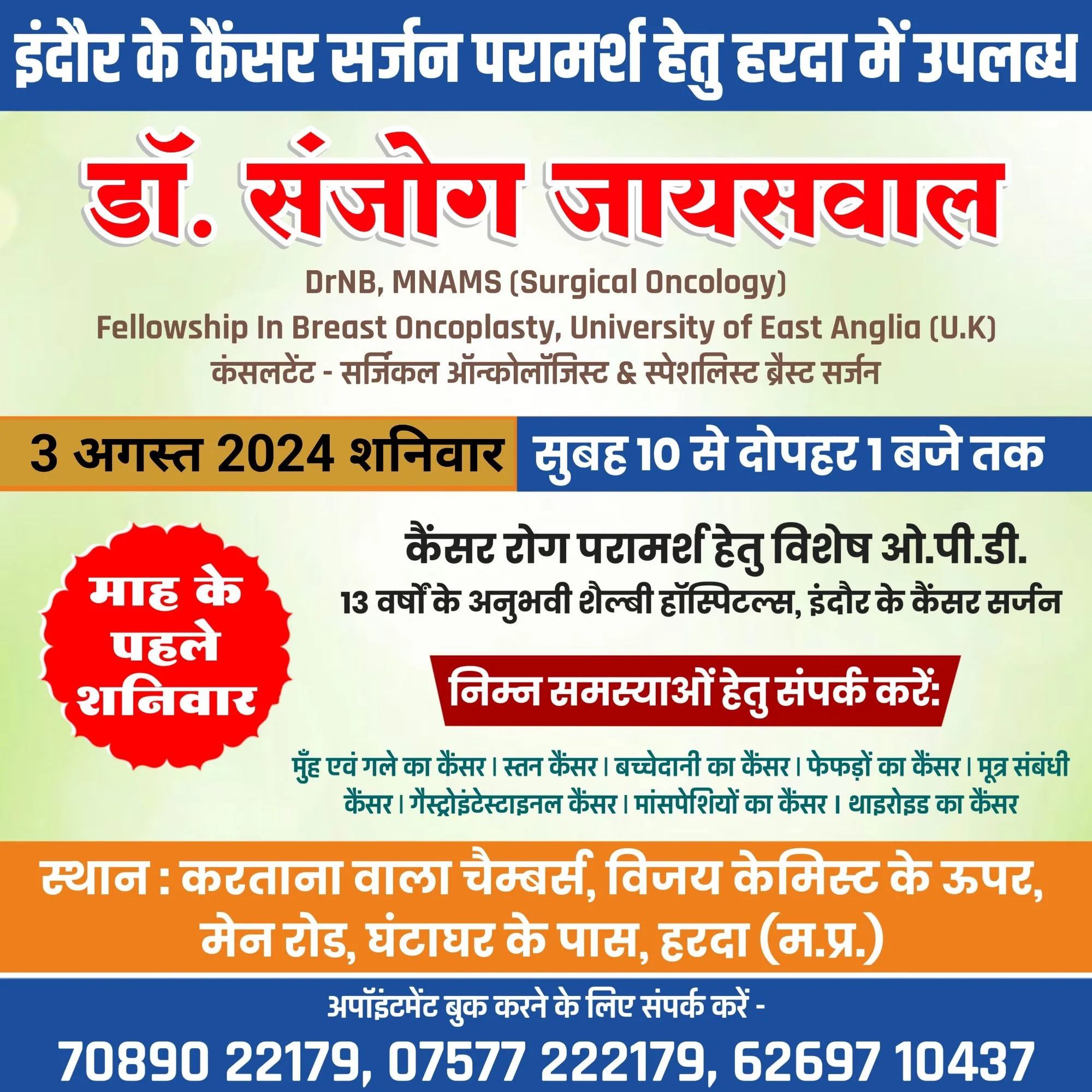 Blog इंदौर के कैंसर सर्जन परामर्श हेतु 3 अगस्त को हरदा में विजय केमिस्ट ( करताना वाला ) उपलब्ध रहेंगे ! August 2, 2024 No Comments