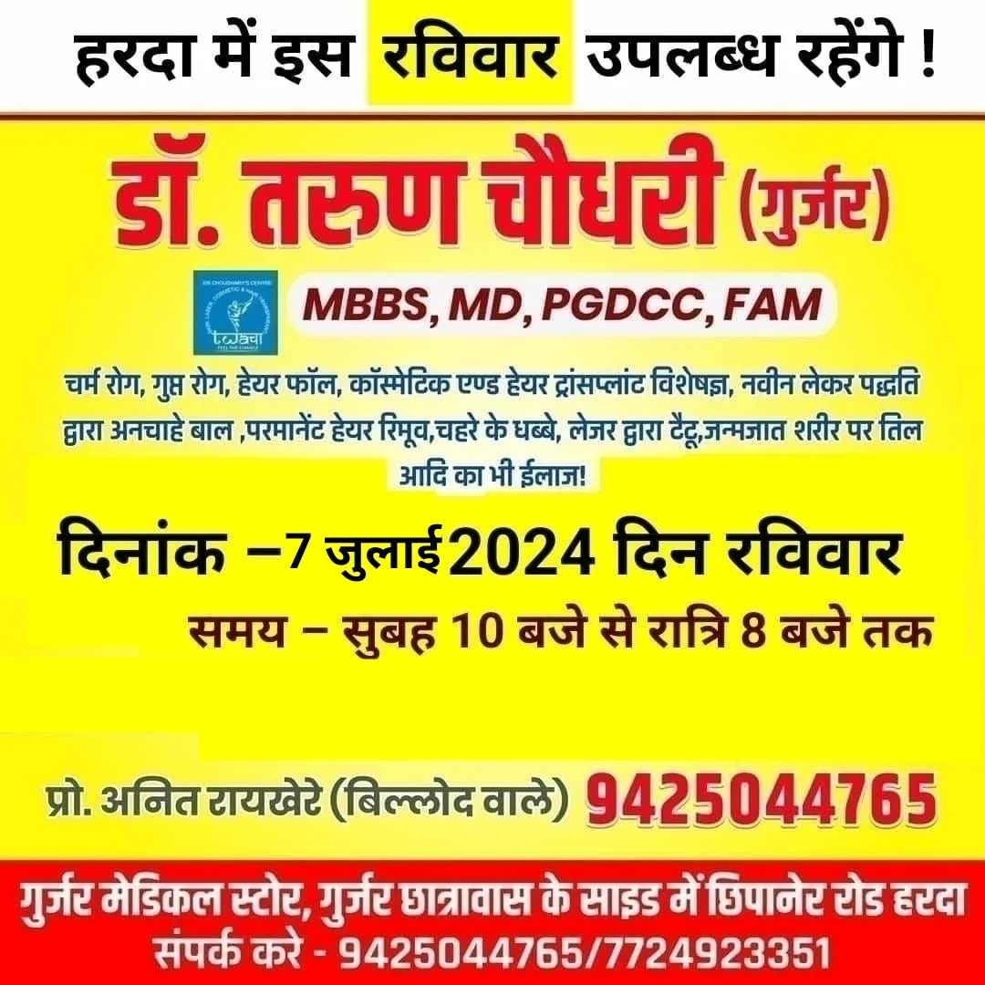 हरदा – इस बार इस रविवार 7 जुलाई को हरदा में उपलब्ध रहेंगे चर्म रोग विशेषज्ञ डॉ. तरुण चौधरी (गुर्जर) गुर्जर मेडिकल स्टोर पर !