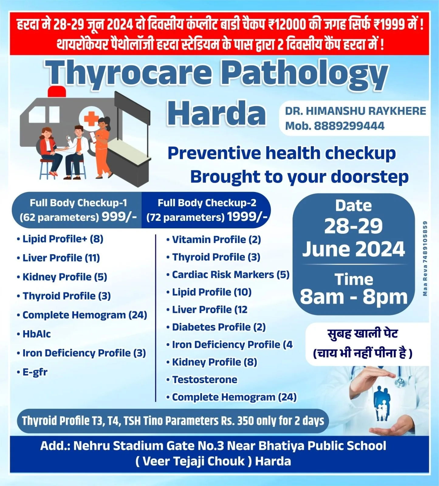 Blog हरदा में 2 दिवसीय स्वास्थ्य जांच शिविर – 28-29 जून 2024 को Thyrocare Pathology Harda ! June 27, 2024 No Comments