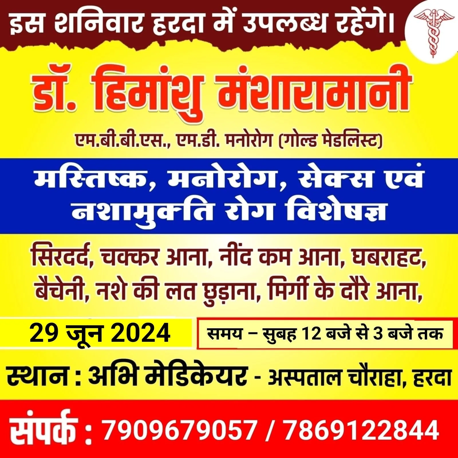 हरदा – 29 जून शनिवार अभि मेडिकेयर पर मस्तिष्क, मनोरोग, सेक्स,एवं नशामुक्ति रोग विशेषज्ञ डॉ हिमांशु मंशारामानी उपलब्ध रहेंगे !