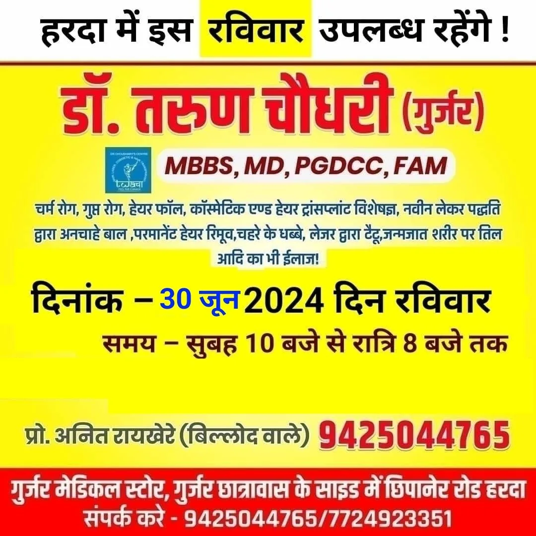 हरदा – इस बार इस रविवार 30 जून को हरदा में उपलब्ध रहेंगे चर्म रोग विशेषज्ञ डॉ. तरुण चौधरी (गुर्जर) गुर्जर मेडिकल स्टोर पर !