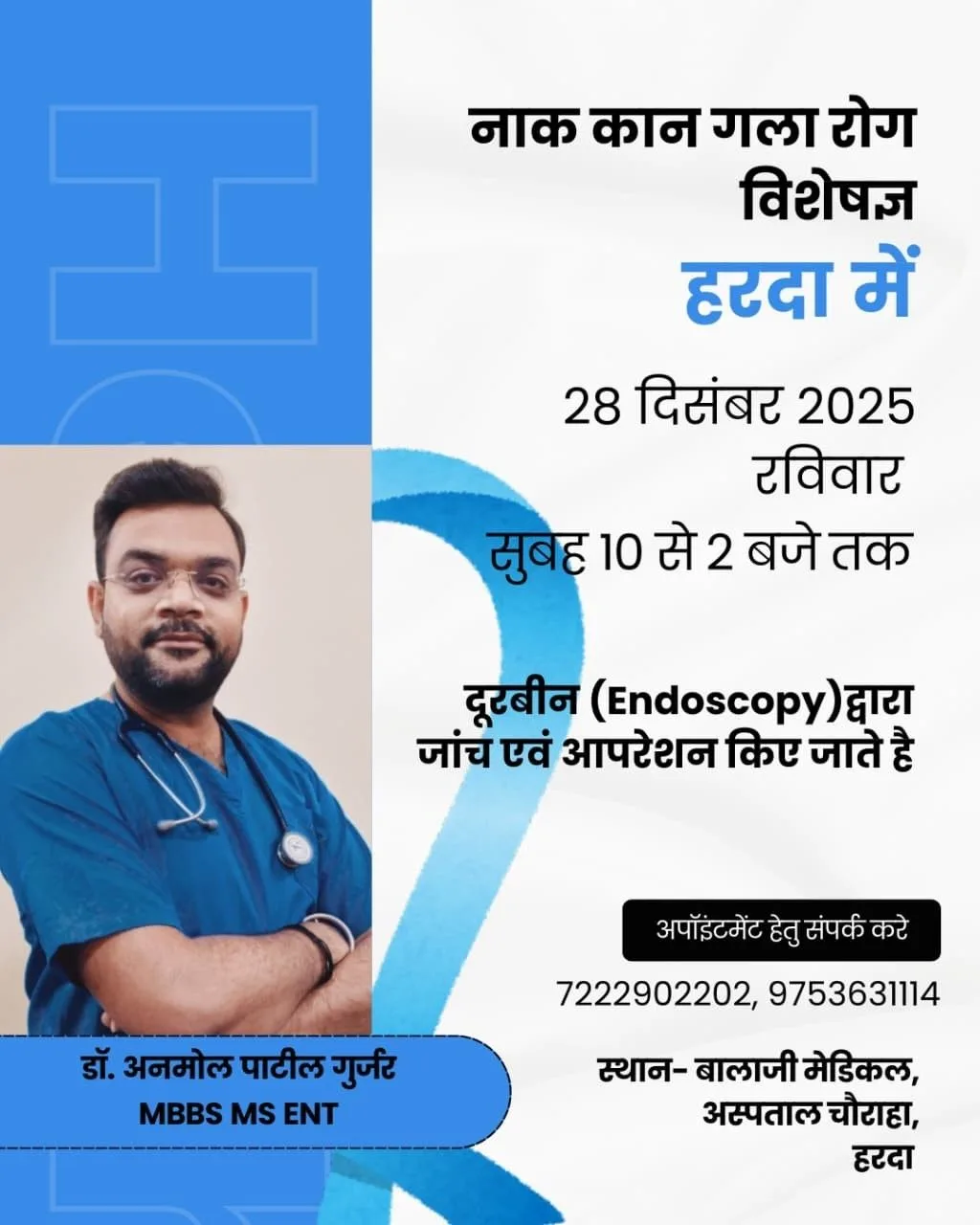 हरदा – नाक, कान, गला एवं कैंसर रोग विशेषज्ञ डॉ. अनमोल पाटिल गुर्जर इस रविवार बालाजी मेडिकल पर 28 दिसंबर रविवार को उपलब्ध रहेंगे !